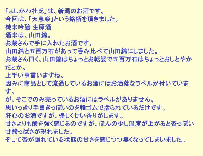 新しく開けたお酒:よしかわ杜氏(新潟)