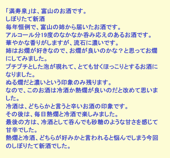 新しく開けたお酒:満寿泉(富山)