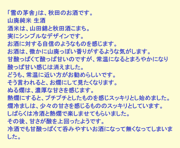 新しく開けたお酒:雪の茅舎(秋田)