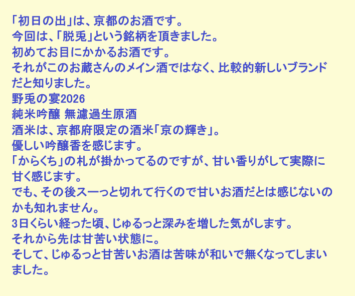 新しく開けたお酒:脱兎(京都)